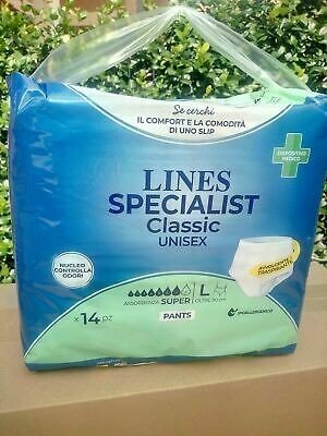 I Lines Specialist Classic Pants Maxi, taglia L, offrono una protezione sicura contro le perdite grazie alla loro elevata capacità assorbente. Con un design ergonomico, si indossano come normale biancheria intima, garantendo comfort e discrezione. La confezione contiene 14 pezzi.