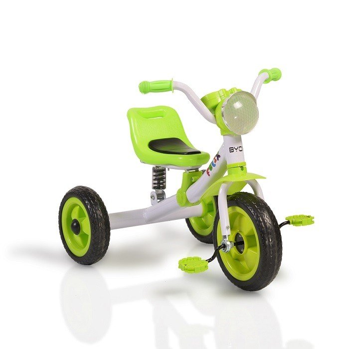Triciclo Moni Felix, colore verde, robusto e sicuro, con maniglia per i genitori e poggiapiedi.