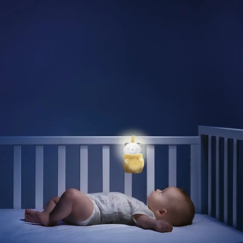 - Atmosfera Rilassante: Una volta inserito nel morbido sacco a pelo, il pulsante centrale trasforma il dispositivo in una luce notturna. In questa modalità, vengono proiettate luci soffuse insieme a melodie rilassanti, ideali per calmare il bambino e favorire un sonno sereno.