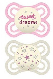 Il succhietto MAM Perfect Night in silicone per bambine dai 2 ai 6 mesi è progettato per ridurre il rischio di malocclusioni. Grazie al suo design ultrasottile e alla sua capacità di illuminarsi al buio, è ideale per garantire un sonno tranquillo.