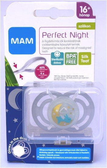 Il succhietto MAM Perfect Night in silicone per bambini dai 16 mesi in su è progettato per ridurre il rischio di malocclusioni. Si illumina al buio, facilitando il ritrovamento durante la notte, ed è realizzato con un design ultrasottile.